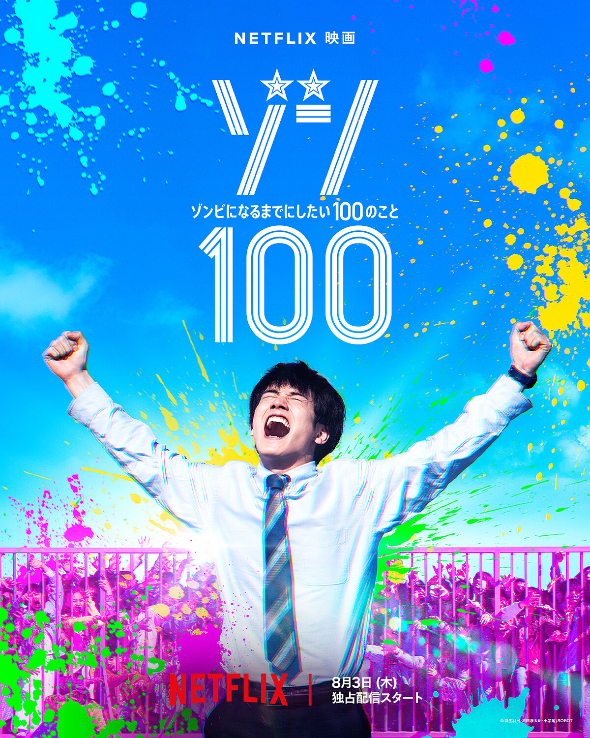 Netflix 去年六月就公布真人版電影製作消息,終於在日前公布8/3於平台獨家上線。同時間播播出動畫與真人版,也能看出 Netflix 非常重視《殭屍100》這部作品。演員陣容有赤楚衛二、白石麻衣、柳俊太郎、市川由衣、川崎麻世、早見朱莉、筧美和子、北村一輝等,石田雄介執導,三嶋龍朗編劇,ROBOT 負責企劃與製作。電影會如何改編劇情與詮釋殭屍的方式也令人相當期待!