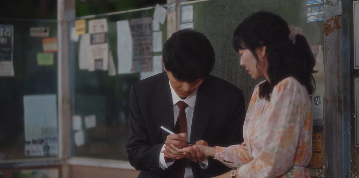 貞淑答應道賢在一起,瞬間下起大雨,道賢手搭在貞淑的肩上,共用一塊帆布遮雨,等公車時道賢在貞淑手心上寫call機號碼,趁機牽貞淑的手,兩人四目相對疑似要親吻,結果道賢就被call回警局加班,整段表演非常含蓄又復古懷舊,是近年難得的純情韓劇!