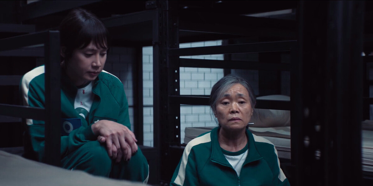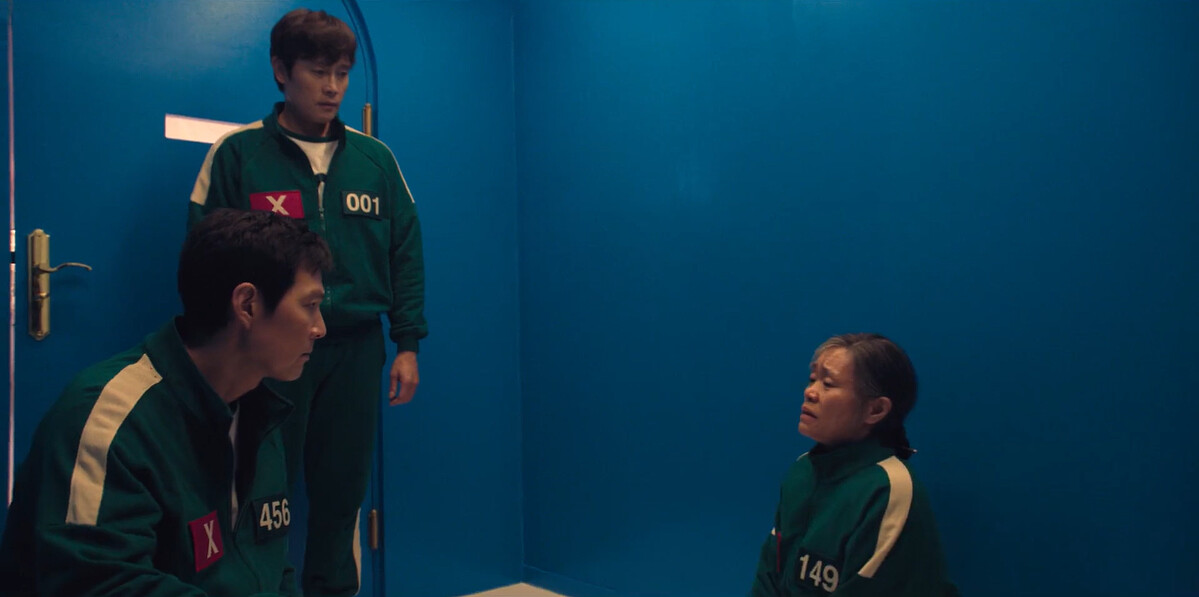 所有分組玩家當中,有一組看上去最弱,編號120變性人賢珠(朴成焄飾)和編號149老媽金子(姜愛心飾)編號007兒子容植(梁東根飾)同組,其中還有不合群的編號044仙女(蔡國熙飾)和老是發抖編號095女生英美(金施恩飾),遊戲被迫開始,尤其看到失敗的組別立刻被三角形士兵打死,英美更害怕了,賢珠喊話英美相信自己穩定軍心,金子說自己挺過韓戰,一定可以玩小孩遊戲,彼此信心喊話開始遊戲一定要成功!