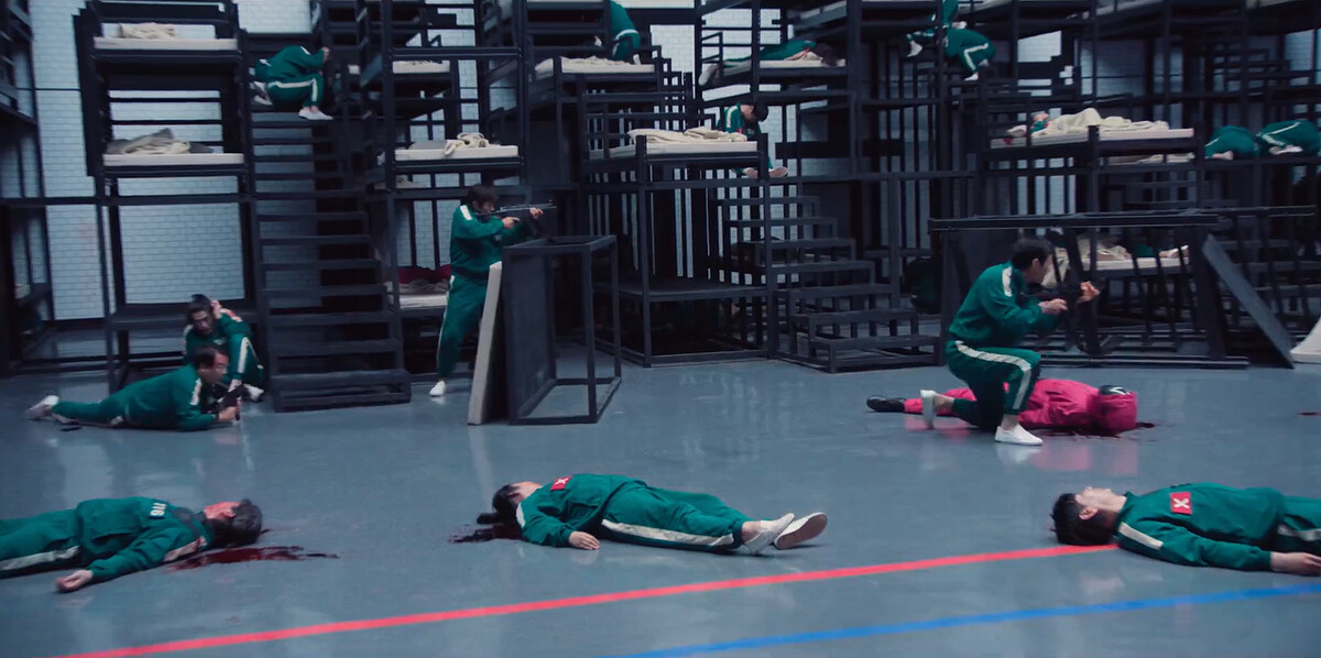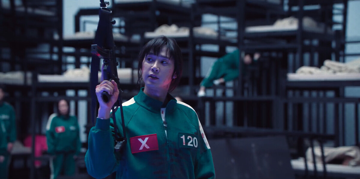 在高處聽命狙擊的槍手,其中之一就是脫北者姜霞,開槍殺場上的玩家,突然姜霞看到編號246是可憐父親朴璟碩在場上,為了女兒的醫療費,也參加了生存遊戲…