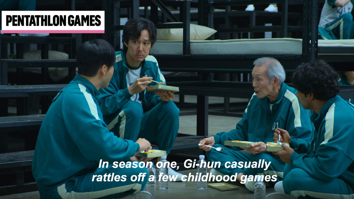 有網友偶然發現,第一季456跟老爺爺吃便當時閒聊就已經講完了後續要玩的遊戲,456說:「遊戲不只是一兩種,打畫片、鬼抓人、丟石頭、捉迷藏,占地遊戲、炸豬排、紅綠燈;女生會玩抓石子、跳橡皮筋、翻花繩。」網友們打趣表示,該不會001老爺爺其實是從456的聊天中找到了靈感吧?其實Netflix事後也剪輯影片表示這是隱藏彩蛋之一。順帶一提,也有網友在Threads分享表示,在姜霞跟部隊長搏鬥時看見了001老爺爺的標本,不過小編慧根不夠沒有找到,你看到了嗎?