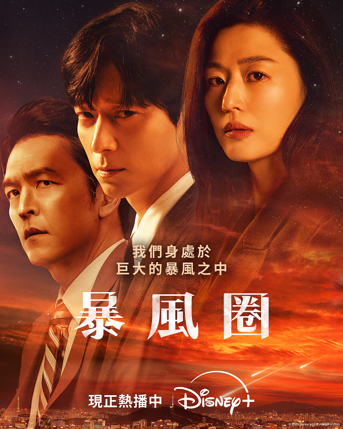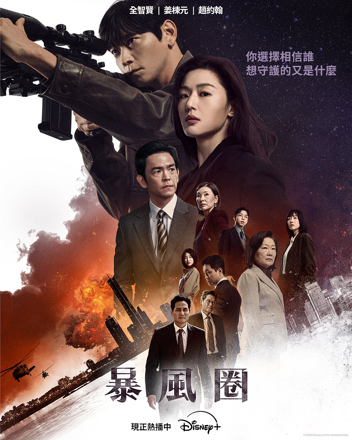 未開播便大受關注的Disney+《暴風圈》,劇情描述韓國前駐美大使徐聞柱(全智賢飾)一邊追查殺害身為總統大熱人選的丈夫真兇,一邊接替丈夫未完之志參選總統,還得防止朝鮮半島陷入全面危機,肩負起政治權謀、生死危機與情感的多重壓力之外;與在身邊默默守護她的神秘男子─白山湖(姜棟元飾),所觸發的危險禁忌感情糾葛,每分每秒更是勾人心弦,劇情張力十足,幾乎每一秒都不容錯過。