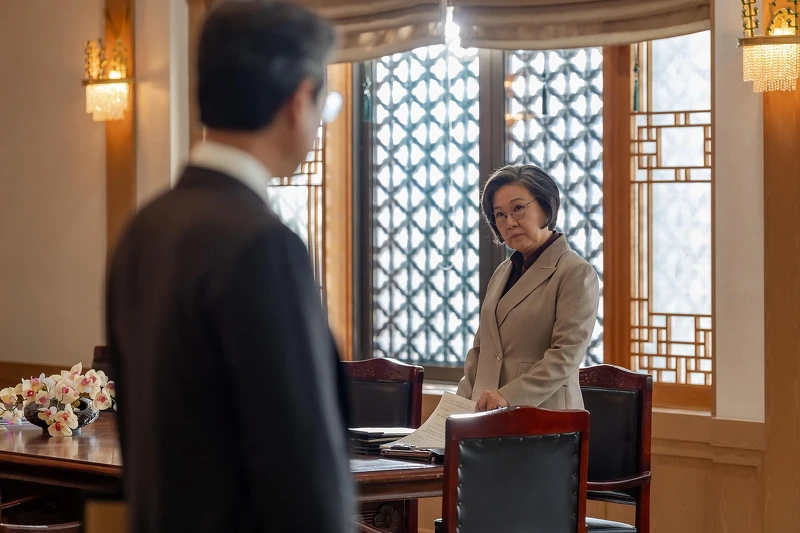 隨著劇情推進,朝鮮半島局勢越來越危險,戰爭的陰影隨時可能降臨。但徐聞柱選擇的不是妥協,而是公開挑戰,她知道這是一場「看不見的戰爭」,被人操縱的新聞、捏造的情報、背後黑手的推波助瀾,都在逼迫世界走向衝突。而她的決定,是把一切攤在陽光下,即使代價可能是性命,她在公開場合中說出:「就算任何情況下,我也不會選擇戰爭。」這不只是政治宣言,而是她身為領導者最堅定的立場。這一刻,她幾乎是在向整個體制宣戰,因為她要揭露的是許多人不願被揭露的「虛假戰爭理由」,這樣的場景,讓劇情張力再度升級,也讓角色的重量感大幅提升,聞柱不是完美的政治人物,但她選擇走的每一步,都是用血與痛換來的。