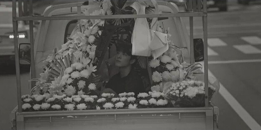 圖說:鮮于海被醫生宣判存活率時,腦中出現黑白跑馬燈,其中一段花店打工畫面,鮮于海窩在小貨車花堆裡,畫面看像喪禮埋在花裡的”遺像”,導演是否暗示走向悲劇?