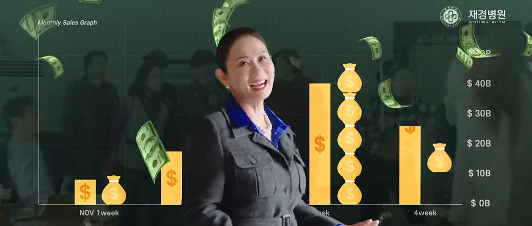 戲劇一開始,就看到黑心理事長金善映拿高爾夫球桿,作勢要打基層醫生,不答應將病重小女孩手術提前安排,還好被院長兒子擋下,金善映連飆髒話罵三分鐘,如果在八點檔播出,恐怕會被”逼逼”消音到整段聽不到台詞,金善映氣勢凌人、丹田有力的開場,立刻確認這醫院系統、理事長、院長都需要被洗滌乾淨!