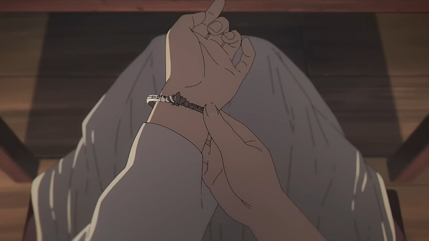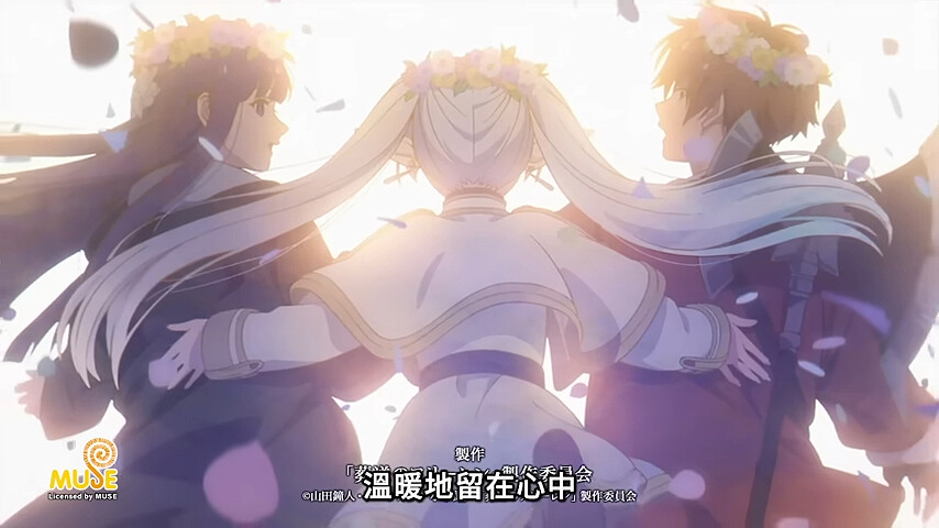 片尾MV有一個畫面,是芙莉蓮和費倫、修塔爾克都戴上花環,畫面一轉,芙莉蓮在費倫和修塔爾克的背後推了一把,冒險應該是完成了所以戴上花環,這裡的”推一把”,難不成芙莉蓮終於懂了初戀這件小事!?費倫、修塔爾克是80年後的芙莉蓮、欣梅爾!?真是令人期待未來感情線繼續增加細節啊!