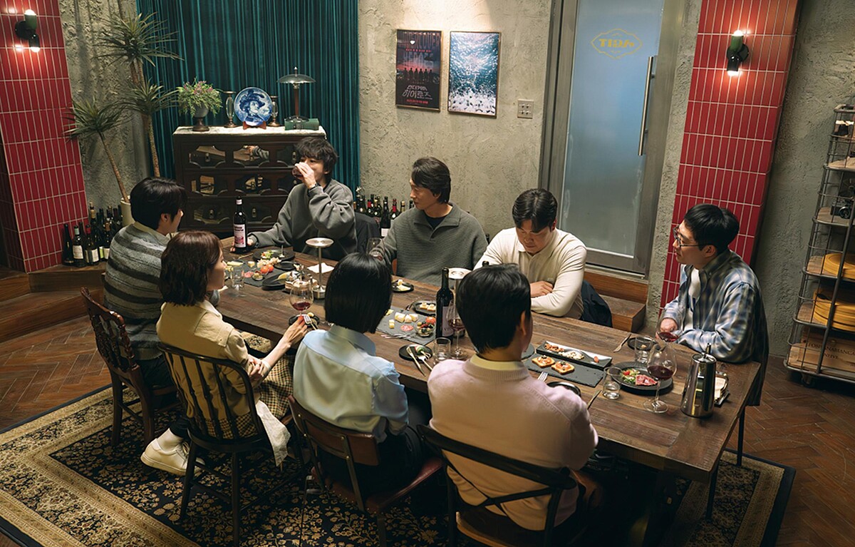 劇中引入了一個帶有微科幻色彩的裝置「情緒手錶」。在第一集時,朴景世提到自己有一個劇本發想來自於黃東滿:如果政府為了控管國民壓力,強制大家配戴電子產品,當配戴者的憤怒、焦慮或自卑感指數超過臨界點,手錶會發出刺耳警報,甚至引來「壓力管理班」的強制介入。雖然這個劇本發想聽起來很荒誕科幻,但它精準隱喻了現代社會對「負面情緒」的零容忍。而在現實劇情中,黃東滿與卞恩雅手上確實戴著類似的手錶,那是一種情緒檢測器,目前正處於實驗階段,需要靠這群實驗者來建立龐大的資訊庫。這個設定極具諷刺意義:在社會規範下,我們被要求隨時展現陽光、積極與自信,一旦顯露出自卑或憂鬱,就會被標籤為「不正常」。當黃東滿在 8 人會聚會上,因為聽到「無業」一詞導致手錶警報狂作時,那一幕既滑稽又悲涼。情緒手錶視覺化了個人內心的崩潰,也諷刺了社會如何暴力地要求個人進行「情緒自律」。但是,如果連感到悲傷與自卑的權利都被剝奪了,人還剩下什麼?