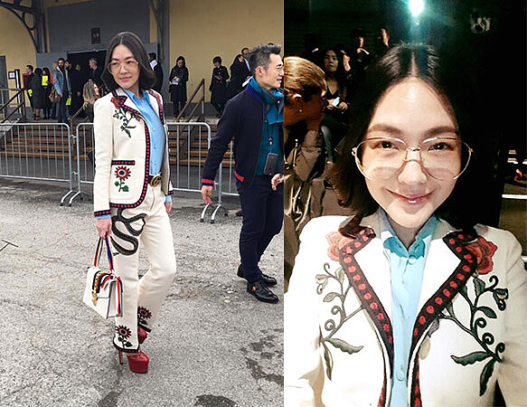 小S抵達米蘭後參加的第一場秀就是GUCCI,身穿一襲上一季2016春夏秀服,花卉圖騰的紅色滾邊白西裝,搭配緞帶背帶的新包款Sylvie和細框金邊墨鏡,跳脫不同以往的性感造型,搖身變為GUCCI最擅長的時髦怪文青風格,讓人耳目一新。秀後接受訪問時,小S也逗趣表示,她試了非常多套,但就覺得這套並非所有人都能駕馭,所以她一定要嘗試看看,聊到穿著紅色厚底高跟鞋出場的心情,小S則說:「感覺就像在練核心肌群一樣!要很ㄍ一ㄥ!」接下來即將出席總是噱頭十足的Moschino大秀,小S又會以什麼造型出招呢?讓人相當期待!