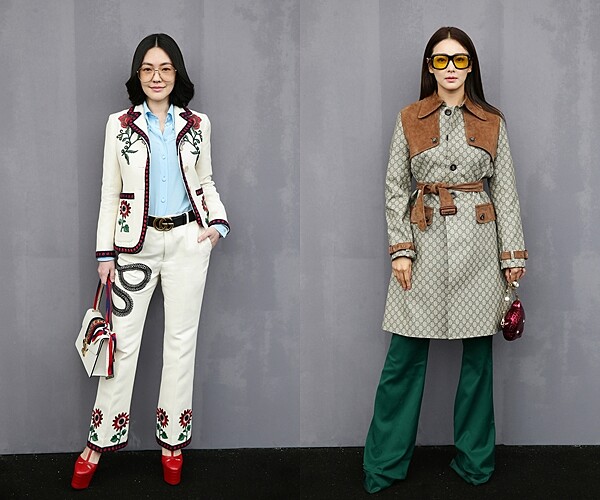 此外,受邀出席的明星也相當吸睛,天后小S這身花卉圖騰的紅色滾邊白西裝春夏秀服,搭配緞帶背帶的新包款Sylvie和細框金邊墨鏡,氣勢難擋!還有中國女星張雨綺也身穿經典雙G Logo大衣出席!要說是場搞怪文青的復古聚會也不為過。