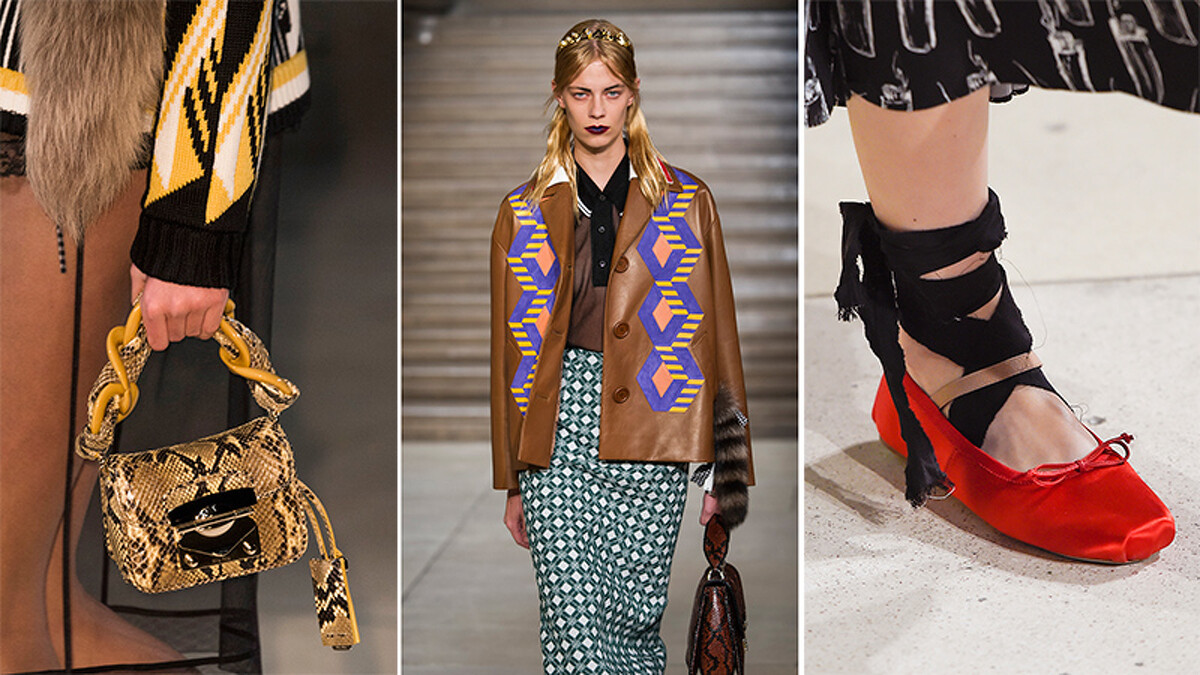 設計師 Miuccia Prada今年春夏透過新的概念、顛覆性的剪裁為Miu Miu塑造出趣味盎然的全新一季輪廓,以繽紛的復古風情,透過顏色與材質的對比,不僅帶來視覺上立體感的震撼,也營造出甜美與叛逆之間的完美平衡。洋溢復古味的中小型手提包款為這次的主要包款設計,運用拼接或珍稀的蟒蛇皮材質變化,增添奢華的優雅風情。模特兒的皇冠造型髮箍當然也成為眾人的目光焦點,此外,搶眼圖紋拼接短靴或繫帶芭蕾舞鞋的大膽搭配,讓整體的造型洋溢出搶眼的個人特色。