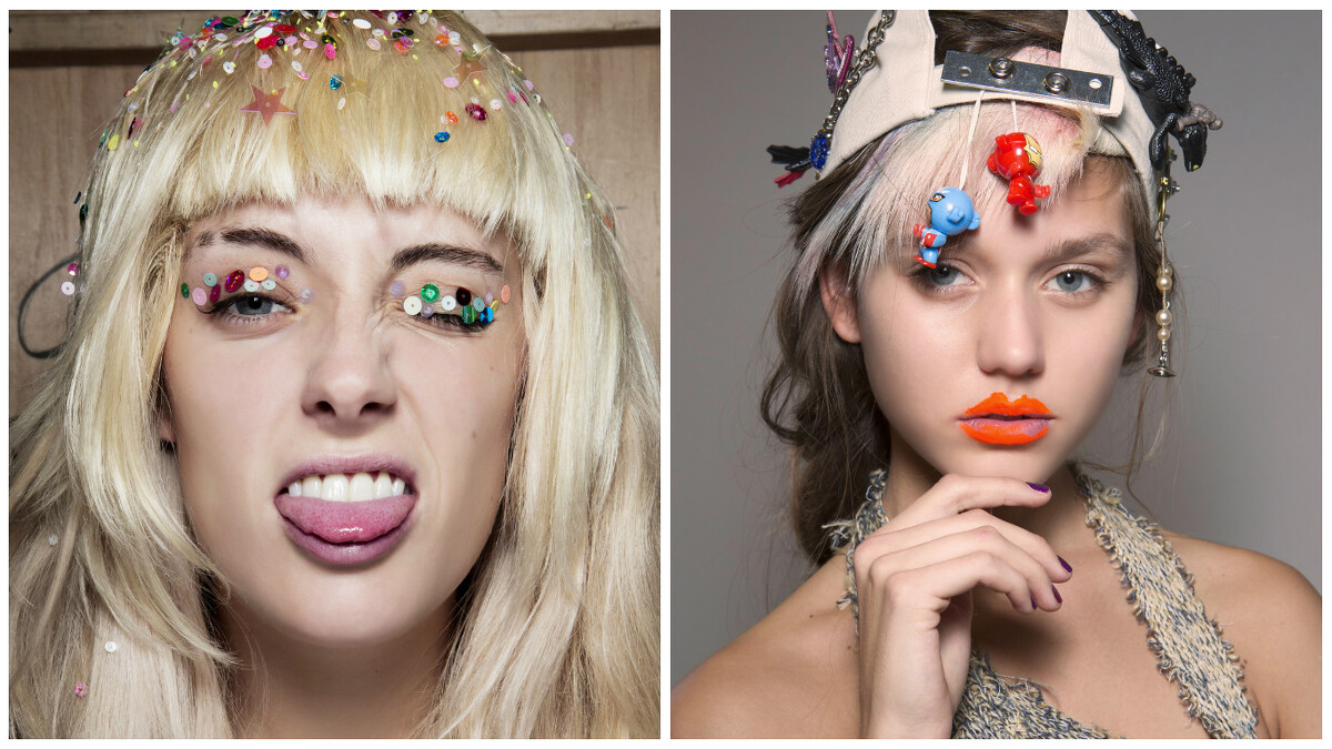 Vivienne Westwood 秀上刻意以樸拙的手法,讓口紅出界、Manish Arora 則將眼影像油畫般有厚度的堆疊在眼睛上,以及 Ashish 像拼貼勞作般從頭髮開始灑落細碎的亮片於 Model 臉上…今年春夏後台彩妝師們童心大發,將肌膚當做畫布,利用各種異材質彩妝做妝容變化,充滿戲劇又俏皮的組合,的確深深吸引住眾人目光。