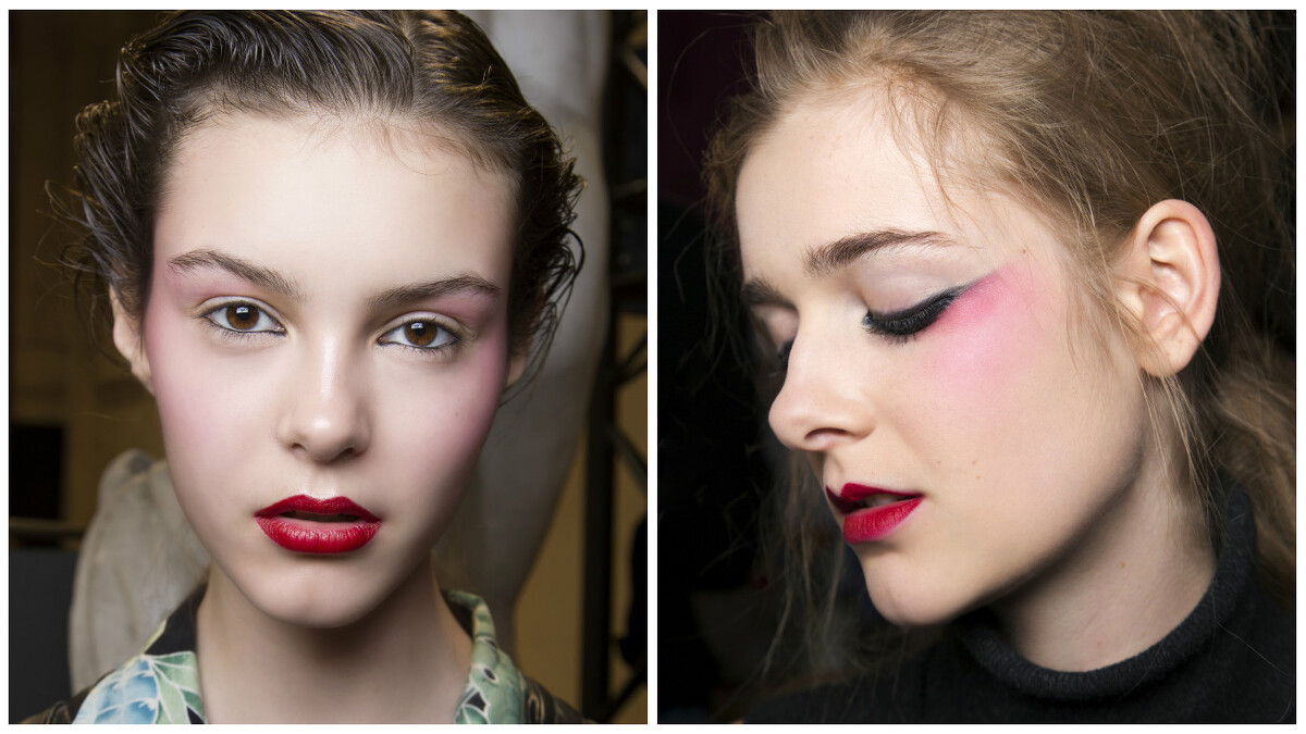 Chalayan 及 Olympia le Tan 的秀上彩妝不約而同展現出女性柔美中的小反骨,和亞洲當紅的「眼下腮紅妝」有異曲同工之妙的美感;都是透過眼周、顴骨的一抹嫣紅,帶來楚楚可憐又魅惑的形象。利用水感濕式腮紅在顴骨到眼皮外C的範圍先打底、再以桃紅色粉末輕掃暈染,搭配上帶點個性的黑色細眼線,甜美中隱約透露出不肯妥協的倔強感。