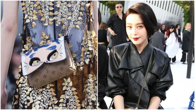 歌舞伎的妝與臉,是貫穿在模特兒提的手包與彩妝上。最特別的是,此處的歌舞伎臉並非尋常見到的那些,而是山本寬齋再加以演繹的。因而能見只露了半張臉的歌舞伎演員圖樣,出現在手拿包、monogram 包上頭。范冰冰就說了:「我最喜歡有貓臉的那個包!」
