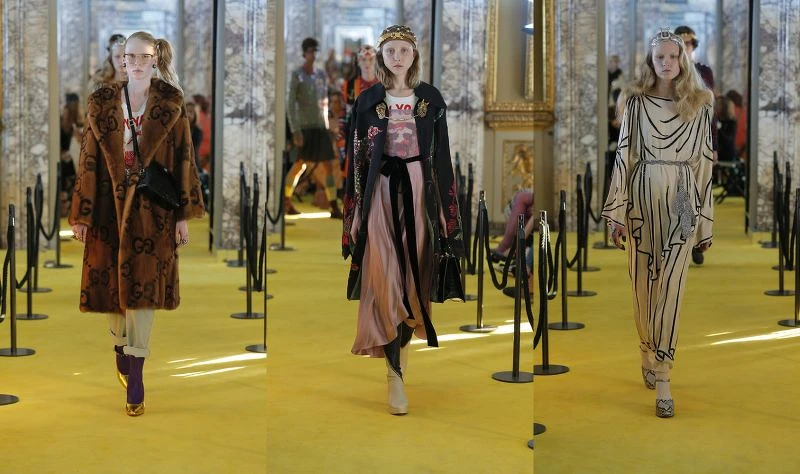 Gucci 2018早春服裝系列,則不比一旁的雕梁畫棟來的遜色,飽滿的色彩、豐富的印花,強烈的裝飾性,是設計師 Alessandro Michele 上任以來成功打造出的 Gucci 風格。帶有古羅馬文化氣息的垂墜設計以錯事手法呈現,富有光澤的提花緞布,則是應景地讓人想到文藝復興時期風格。設計師更發揮強大的混搭技巧,讓女神感十足的服裝,也能出滿英倫女孩般的瀟灑。粗框眼鏡、亮眼頭帶,還有些零瑯滿目的華麗配件,勢必要讓即將走進 Gucci 店鋪的你我流連忘返。Alessandro Michele 打破時空藩籬,巧玩文化混搭,他用服裝寫詩,也用風格說愛。他用一場時尚的文藝復興對家鄉示愛,而你我都可以是這場盛宴裡的大藝術家。
