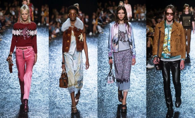 更令人印象深刻的是這個被放在牛仔布料外套、夾克外套與服裝上的生動小人物塗鴉刺繡與印花,這是設計總監Stuart Vevers為了向紐約新普普藝術家 Keith Haring致敬的經典圖騰,這看似浪漫又充滿懷舊的叛逆氣息,也把美式文化的經典:嬉皮與隨性風格詮釋到位。