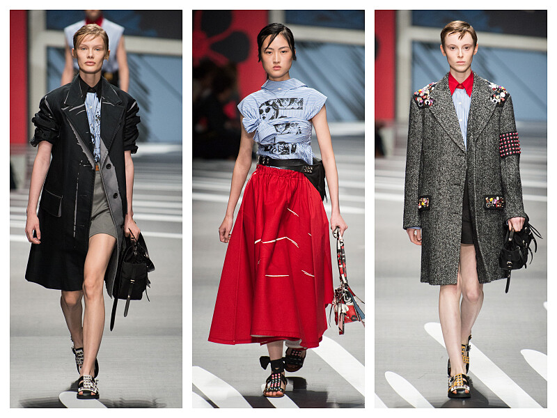 或許我們可以說,2018 春夏女裝系列是一個很 Miuccia Prada 的系列。拋開浪漫的粉嫩色系,新一季的女人要的是霸氣!除了各式線條鋒利的服裝,能夠展現出女人的強烈自信外,無論材質拼接的玩味手法,或是與8位女性藝術家合作的漫畫風格插畫作品,都是設計師 Miuccia Prada 為人熟知的設計觀點。