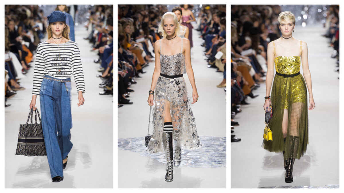 擔任開場的名模Sasha Pivovarova身上的橫條紋衫上頭,斗大的字樣寫著"WHY HAVE THERE BEEN NO GREAT WOMEN ARTIST",引述自美國藝術史學家Linda Nochlin的ㄧ句話,道出Maria Grazia Chiuri對當代現象的批判眼光。就風格而言,在保有舊有輪廓的前提下,加入了更多的裝飾元素。格紋、直紋、圓點適時為服裝添入ㄧ些個性,運動、街頭或各式藝術圖騰,都因爲精準的剪裁而顯得氣質出眾。前開衩的各式雪紡洋裝,讓妳浪漫也霸氣,如果妳是Dior的配件迷,到了新的一季依舊有可能會失心瘋。項鍊、耳環、戒指、頸鍊,樣樣不缺,包款添入了如金屬感、圖騰、流蘇等元素,更在背帶上大作文章,讓華麗風格可以輕鬆上肩。