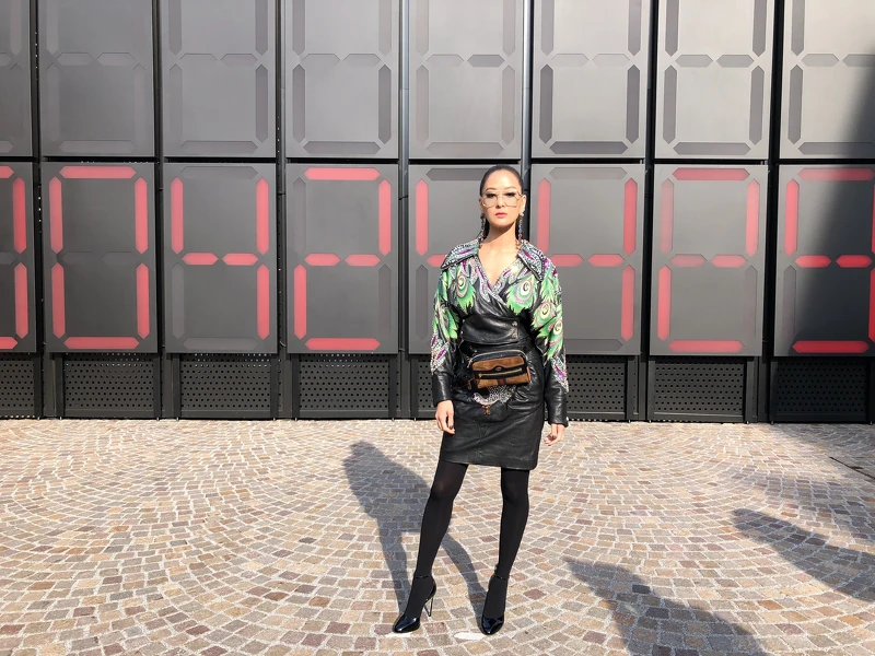 孫芸芸米蘭時裝週行程的第一場大秀,來到了古馳。現場宛如手術室般的陳設,讓芸芸大呼驚奇。而最說到重點的觀秀穿搭,她則是選擇了2018春夏系列當中的第13套造型。結合了80年代氣息,帶點華麗搖滾意味的皮衣與窄裙,在繁複圖樣與水鑽裝飾之下,讓孫芸芸看起來明星氣場十足!但有別於伸展台上的呈現,芸芸選擇以黑色絲襪做搭配,不僅拉長了整個人的比例,也看來又酷又帥。另外在包款的選擇上,Ophidia 腰包不僅是品牌近來很熱門的話題款式,腰包款同樣也是近期穿搭重點單品。在芸芸的第一個公開行程之後,讓人見識到她駕馭單品的超強功力。