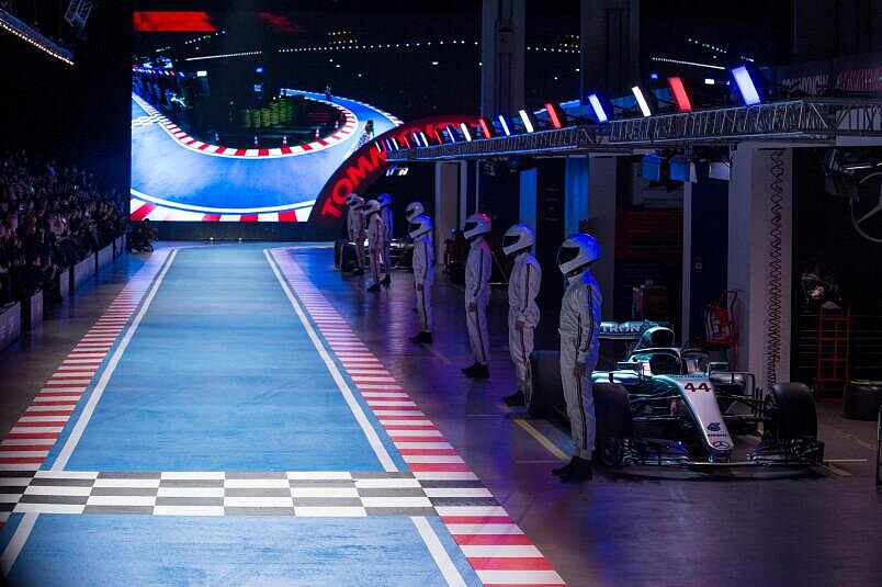 這一次,Tommy Now Drive 大秀,除了是品牌再度與 Gigi Hadid 攜手,更加入了賓士這個官方合作對象,以F1 一級方程式賽事帶入秀場當中,讓現場多了分緊張刺激的速度感,除了 See Now Buy Now 的限定販售店鋪外,還能讓賓客挑戰彷如在真實賽道上快手換輪胎的體驗。打造成車道一般的環形走道成了超長伸展台,Daft Punk 音樂一下,現場來賓瞬間腎上腺素狂飆。