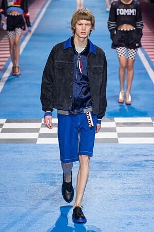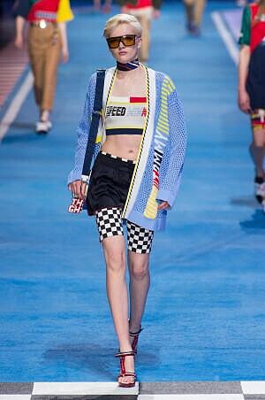 整個系列固然是以賽車運動文化為靈感,紅、藍、白、黑,這幾個經典色彩不僅與主題契合,更是能代表 Tommy Hilfiger 品牌精神的組合。超模 Gigi Hadid 毫無意外地擔任開場的角色,一席拼接緊身皮褲與Cropped Top造型,結合了性感與賽車的速度感,帥勁十足。