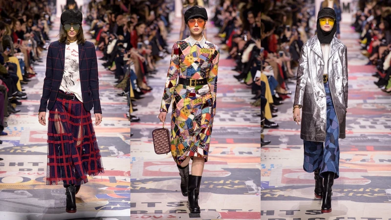 從迷你裙、及膝裙到曳地長裙,長短不一的裙裝設計,象徵著穿搭沒有規則,格子花紋帶著濃濃的學院氣質,帥氣的風衣無論與中性或是女孩氣息濃厚的造型做搭配,都是很老巴黎的情調,拼花布的手法也被製成各式裙裝或寬筒褲,甚至是丹寧造型,也用上了同樣的裝飾手法。透視烏干紗上的繁複花朵刺繡與大量流蘇元素,不僅帶來了一些異國風情,更多了一分嬉皮意味。而幾件線條俐落的銀色皮革單品,也再度回應了60年代的代表性風貌。