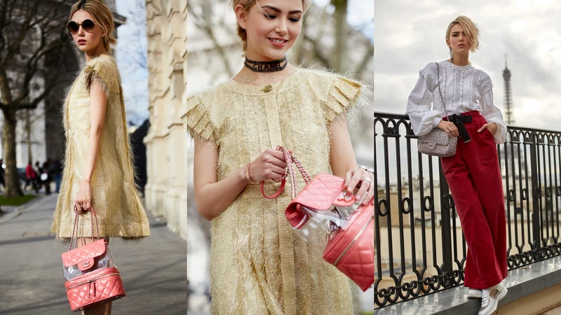 巴黎時裝週期間看完秀的昆凌也換上兩套充滿法式風情的春夏穿搭,第一套身穿2018春夏系列的刺繡銀線流蘇黃色褶飾洋裝,搭配蜜桃色皮革拼接透明PVC雙層設計小背包、黑色CHANEL頸鍊和珍珠鑲飾鏡片太陽眼鏡,散發俏皮甜美的氣息。