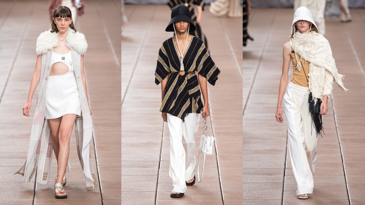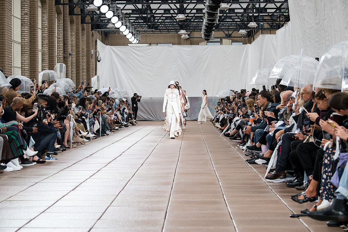 3.1 Phillip Lim 的2019春夏大秀選在曼哈頓下城一處的校園內舉辦,位於頂樓的一隅沒有矯情的秀場裝置,燈光、音樂,或許就足以就一場服裝發表。而位於頂樓露台的伸展台,因突然變臉的天氣而讓賓客們吃了些苦頭,但會場發放的透明雨衣和雨傘,倒是成了另一片風景。這樣確確實實的景象,或許正適合 Phillip Lim 的設計,真切、真實,而帶著一抹趣味。