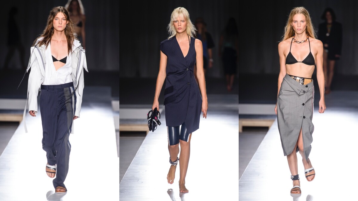 整個系列的前幾套造型,依舊保有了品牌過去常見的幹練樣貌,幾件運用西裝布料打造的鉛筆裙、寬褲或洋裝,都是帥氣十足的款式,而加大肩線的西裝外套與各是融入運動風格的單品做搭配,則是很值得參考記下來的造型手法。