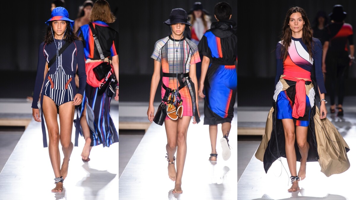 而進入系列的中段,運用主題更加地鮮明,明確地說,是加入了更多的衝浪元素。色塊拼接與尼龍材質,是表現運動感常見的表現方式,幾個搭上了類似潛水防寒衣材質的內搭褲的造型,像極才剛從浪板上回到城市街頭的個性女孩。