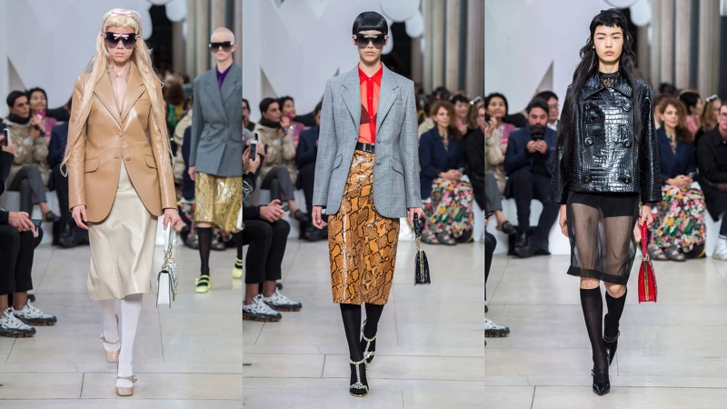 來到秀的中半段,背景音樂除了一開始的鋼琴旋律,也加入了節奏感較為強烈的鼓聲伴奏,似乎在悄悄透露著風格的轉變:換上皮革面料的西裝裝束除了有簡約的素面款,也包含了絢麗的蟒蛇皮,搭配的襯衫甚至裙子則以性感的透紗取代其餘面料,替嚴肅的裝扮添入女性魅惑,同時體現得宜卻又叛逆的女性特質。