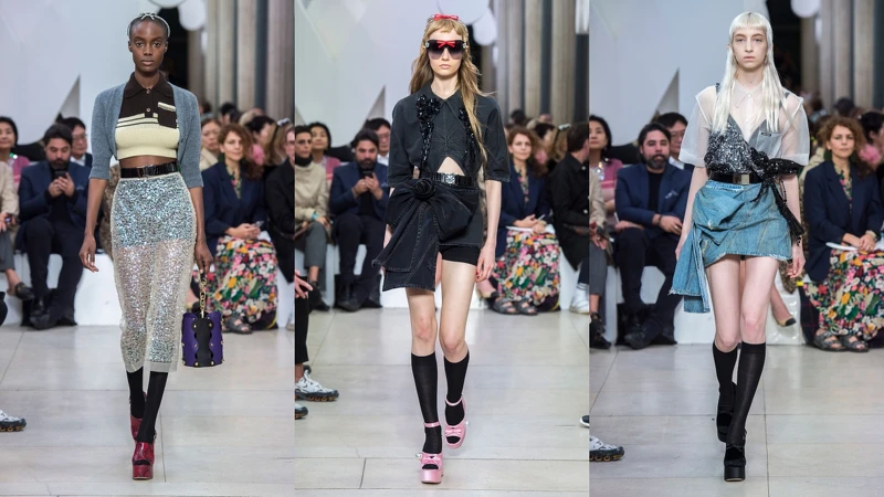 中後段開始,大量的閃耀元素如亮片、水鑽,紛紛穿梭在模特兒身穿的服飾上,像是其中幾套以拼色短版Polo衫搭上鑲滿亮片的微透膚七分裙,如此巧妙搭配碰撞出Miu Miu女孩復古華麗的一面。此外,花朵造型的裝飾則換成了甜美的蝴蝶結,並透過丹寧面料共組出多套率性氛圍的時髦裝束。