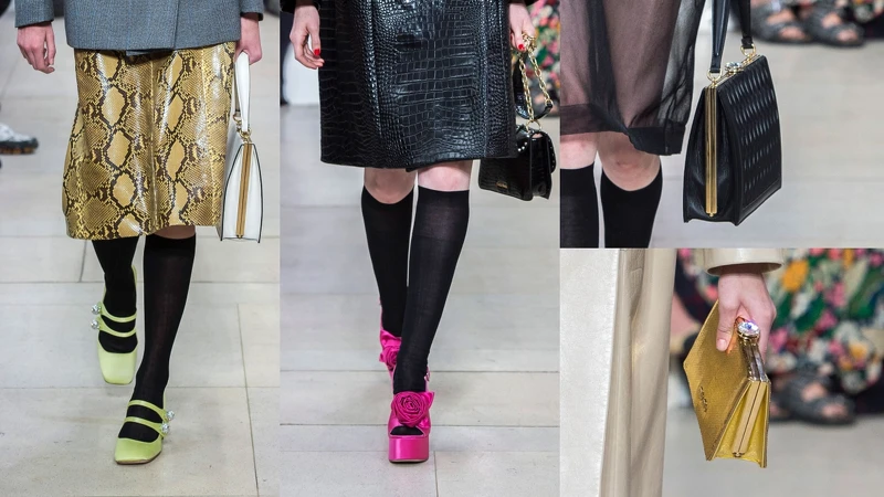 令人關注的配件則是以模特兒們腳上的繽紛厚底繫帶跟鞋,和同樣擁有超粗鞋跟的瑪莉珍鞋為主,由此而見,厚底鞋的魅力不但將持續延伸至明年春夏(完全是嬌小女孩的一大福音~),亮麗的色彩更是風格關鍵!手袋則以珠扣式的立體包款呈現另一波復古風潮的回歸。