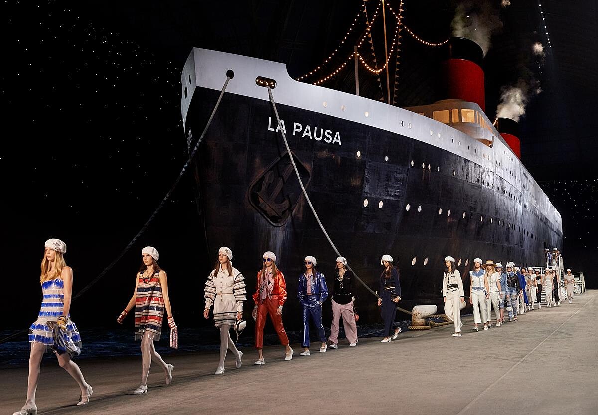 呼應度假感,全世界走透透的Cruise系列,將今年五月於巴黎大皇宮發表的早春系列搬到了泰國湄南河畔舉辦,向來在秀場佈置出盡奇招,繼超市、火箭、餐館、機場等令人瞠目結舌的場景外,今年更是將巴黎大皇宮打造成郵輪碼頭,及一艘以香奈兒女士位於蔚藍海岸「La Pausa」別邸為名的巨型郵輪,準備帶著乘客航向渡假天堂。