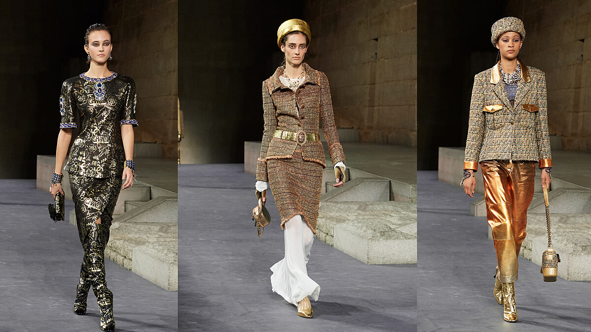 這次的工坊大秀選在紐約舉辦,許多人都猜測,整個系列將圍繞著紐約摩登的都會活力,還有獨一無二的街頭風格,但結果可說是完全出乎意料之外。首先是秀場選擇在大名鼎鼎的紐約大都會藝術博物館,更精確地來說,是在博物館內的薩克勒廳舉辦,這也是整個博物館中最受歡迎的展廳,裡頭保存著西元前15世紀由砂岩所建的丹鐸神廟(The Temple of Dendur)這個鎮館之寶。以擁有數百年歷史的古文物為伸展台背景,可以說是史無前例,當今恐怕也只有Chanel做得到了,而這次的工坊系列,自然是環繞著古埃及華麗、神秘而充滿吸引力的裝飾藝術而生。以修長的白色洋裝為基礎,讓人想起古埃及壁畫上的白袍身影,無論是斜紋軟呢套裝、外套、針織單品或是晚裝,都出現了大量的金色元素,如沙漠中的烈日幻影,也如法老坐擁的萬千財富,在加入品牌經典的黑白色調,以及富有民俗色彩的土耳其藍,至於出現頻率極高的金色高筒靴,絕對是明年秋季值得入手的氣勢單品。而在飾品方面,聖甲蟲與鱷魚皮紋與彩色寶石相得益彰,就整個系列而言,是高調再高調,而強烈的裝飾性與細緻的工法,也正符合工坊系列的核心精神,那便是精準地表現各大工坊精湛的工藝技法。有趣的是,其中幾套造型,把埃及的象形文字與手繪圖像,結合街頭塗鴉風格裝飾在服裝上頭,發揮古今交融的連結作用。其中,由法國藝術家Cyril Kongo創作的塗鴉作品,不僅展現了關鍵性的角色,更重新強調了Chanel最具代表性的法式風格領導角色。這是一個頌揚時尚、工藝、摩登與文化的系列,而就整個系列的呈現而言,確實是個令人需要屏氣凝神而細細品味的出色作品。