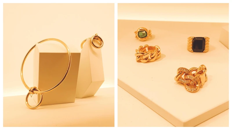 配件方面,有別於以往較小巧及鋯石元素,早秋系列的配件使用大量黃銅與蛋形輪廓,據說是設計師Daniel Lee取源自蛋形的「新生」及「源頭」的意義,對應至設計配件之中,尺寸與份量感十足。