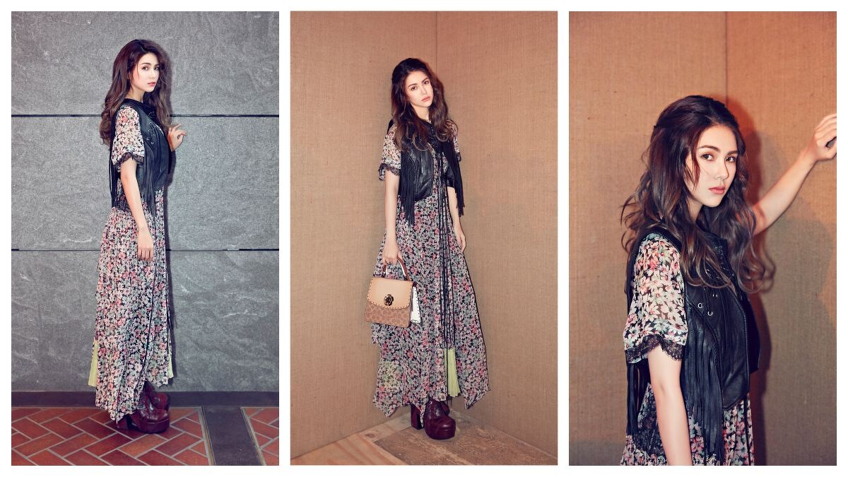 在秀後接受《美麗佳人》採訪時,大方透露自己在看似單薄的洋裝下可是一層層的發熱衣與暖暖包,率直的個性讓人一秒被圈粉,另外也透露其實平時自己不太嘗試過分甜美的雪紡材質,但這件洋裝在裙襬處蘋果綠的拼接百褶布料卻讓整體更有個性,搭配流蘇皮革外套也更多了一份個性與態度。