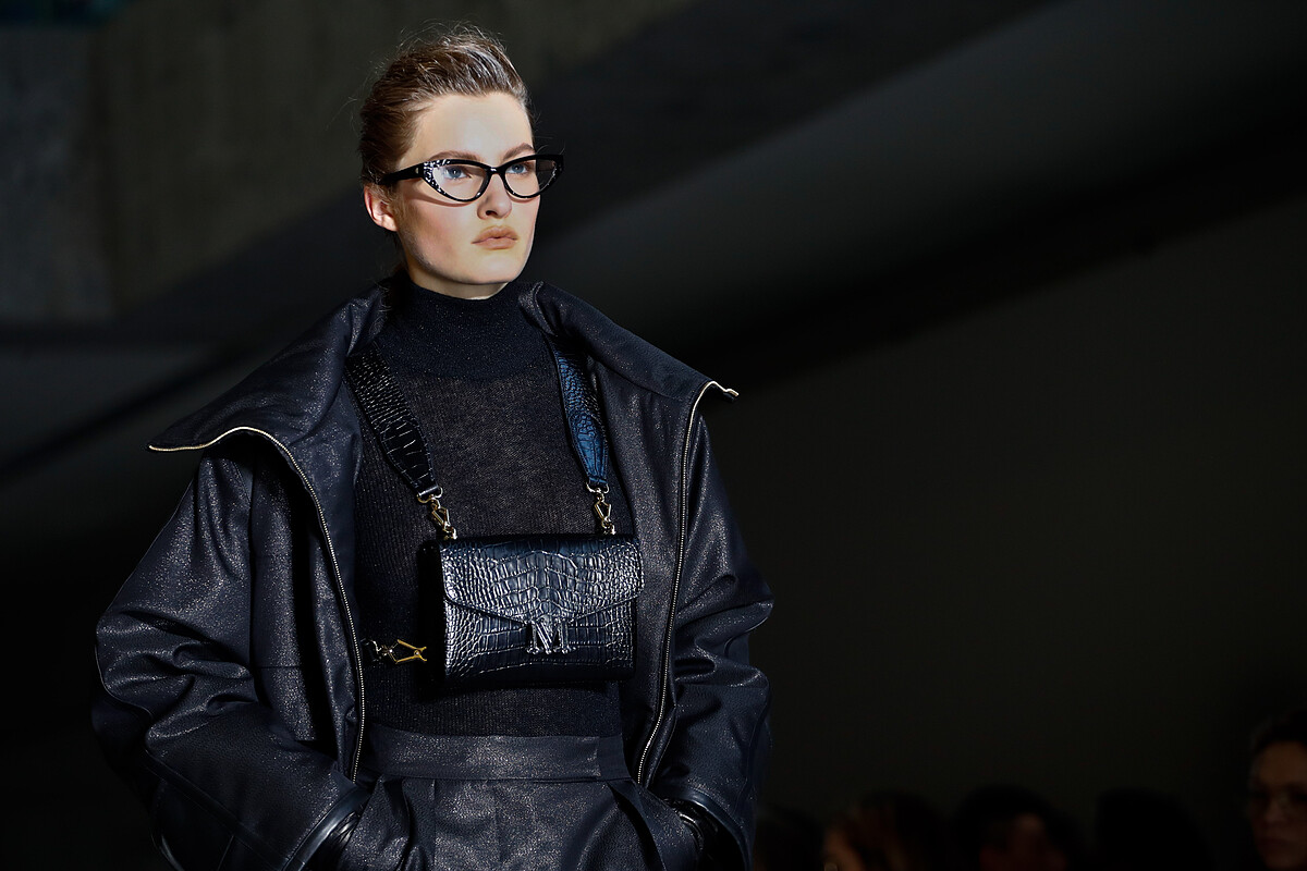 整體輪廓更寬大、硬挺,風衣、披風、西裝外套加上墊肩,多套剪裁更搭配超大皮革口袋,彰顯女性權力。裙子故意做成像是從男性褲裝尚剪裁下來的,搭配過膝長筒靴,展現修長又性感的氣勢。其中最讓人眼睛為之一亮的,便是這款配戴在胸口正前方的皮革方包,宛如女特務的配備一樣帥氣的讓人想要馬上擁有!