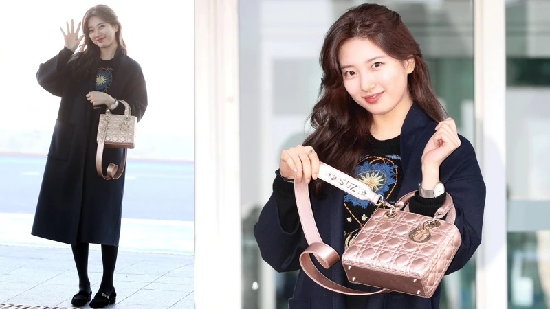 首次出席Dior時裝大秀的「國民初戀」秀智,身著品牌最新的服裝系列現身仁川機場。精緻的圖騰刺繡針織上衣,外罩上深藍色過膝大衣,簡單卻顯優雅,腳踩的低跟芭蕾舞鞋更顯氣質出眾。此外,手上那顆帶有金屬光澤的粉色Lady Dior不僅搶眼時髦,肩背帶上更飾有SUZY字樣的金屬裝飾,而這即是本季最新推出的客製化服務My ABCDior,無疑賦予了包款專屬的個人風格!指尖與手腕上的Rose des Vents戒指和La D de Dior腕錶則替造型裝點上知性的韻味。