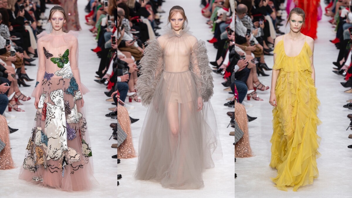 後半段則以隱喻著愛情情愫的玫瑰、蝴蝶、花卉…等亮片刺繡,彰顯品牌的精湛工藝,然而儘管是結尾幾套的素面款,也依然在透膚薄紗的面料下,飄逸出迷人的脫俗仙氣。