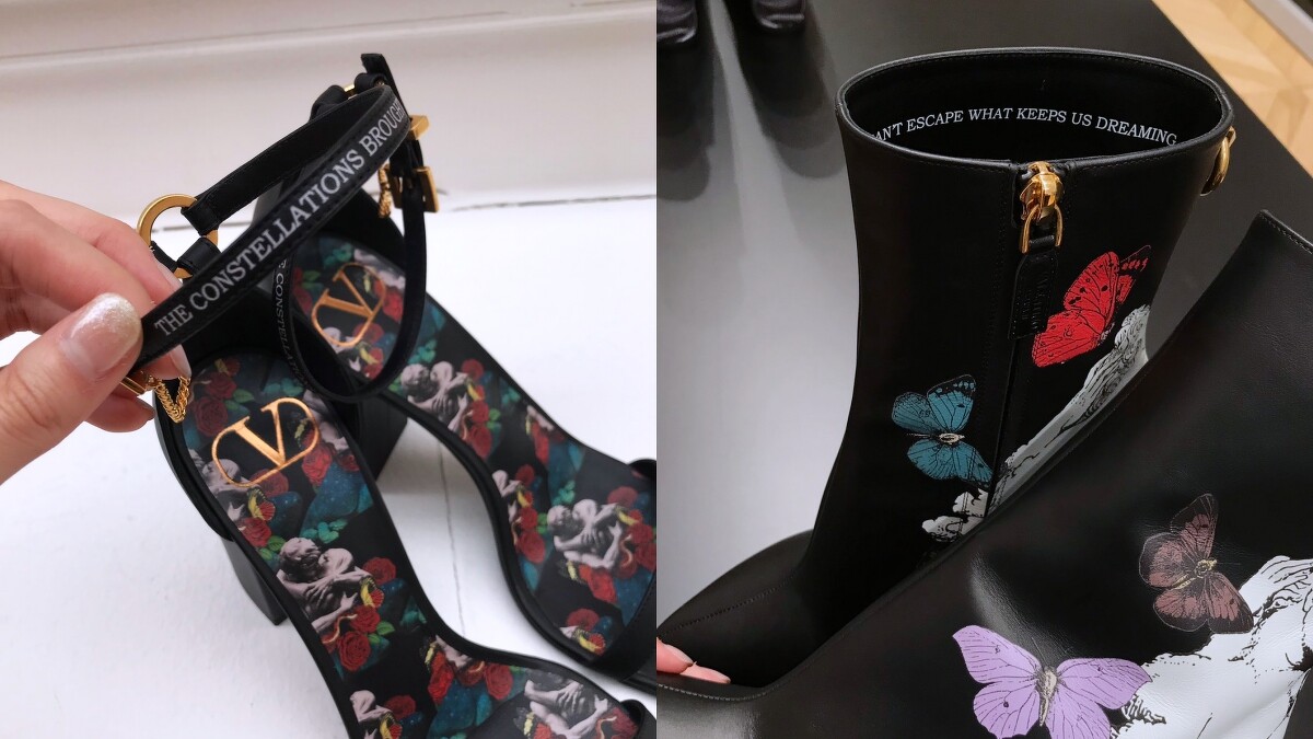 除了一套套的衣服與禮服上有著表徵愛的圖像與詩詞外,配件上像是手袋和鞋子也有著相同的設計概念,特別的是,除了面積上清楚看見的圖樣,Pierpaolo Piccioli還將那些優美的詩詞隱藏在了包包內裡,甚至靴子裡與高跟鞋的繫帶上,玩味的手法不僅超吸睛,也賦予每款設計別具意義的價值。