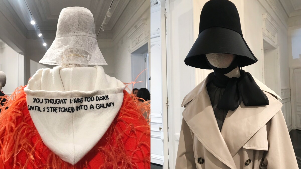 而在秀場一開始的幾套造型中,綁帶式的Bucket Hat穿戴使整體多了神秘的高雅氛圍,材質使用除了有最常見的羊毛,另外像是透紗蕾絲和羽毛也是替帽款增添浪漫的變化選。
