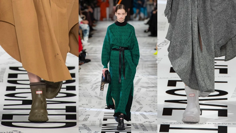 然而除了手袋之外,模特腳上的靴子也是大有來頭,找來以雨鞋著名的英國經典品牌Hunter,為最新系列的造型打造腳踝短靴,當然材質不外乎是以可延續使用並回收的橡膠製成。你說,有誰能像Stella McCartney如此守則呢?
