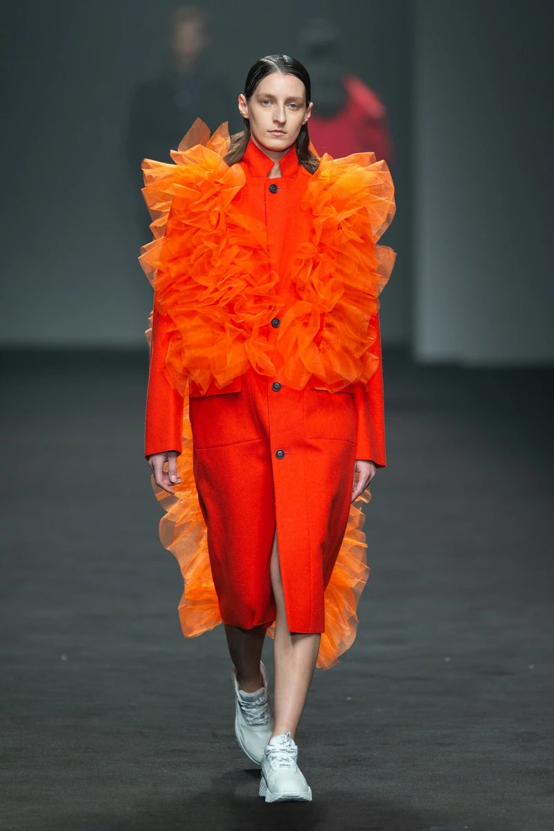 立體紗網裝飾在喀什米爾山羊絨羊毛衫、壓縮毛呢大衣與質輕豐厚的羽絨服,呈現輕盈且巨大的輪廓,藉由襉線車棉裝飾將服裝表面肌理再造,同時賦予立體的結構設計,與鮮明的色彩產生碰撞。象徵女性優雅的朱紅,以工裝元素及運動細節重新詮釋,古典羊腿袖襯衫以科技功能性面料裁制而成,兼備時髦度與實穿性。