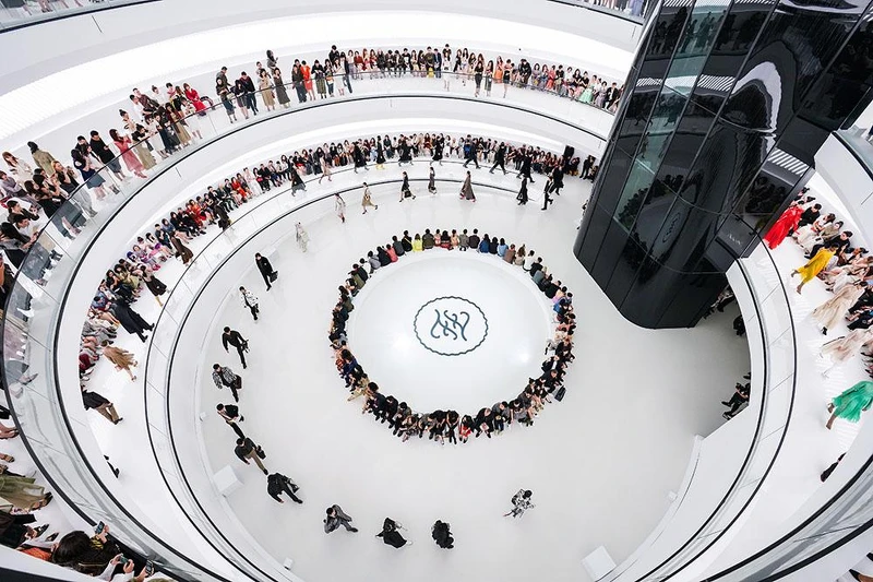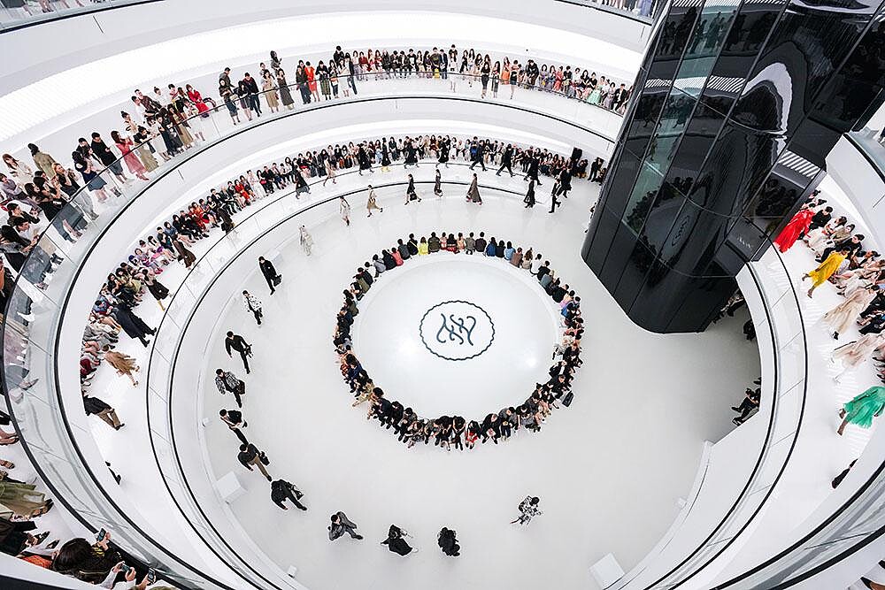 這場秀是FENDI自2007年在長城上辦秀後,再度來到中國辦秀,至於為何選擇在上海?Silvia Venturini Fendi表示,她認為上海是一個完整結合傳統文化與摩登未來的城市,對於FENDI而言,為卡爾時代畫下一個完美句點並重新迎接新的一頁,這裡正是最佳的選址。秀場是上海致力於推動當代文化與藝術的寶龍美術館,純白的螺旋狀建築設計,座位盤旋而上,讓每個人都能坐在第一排,完整細看卡爾的最終作品,科幻摩登的秀場氛圍也宣示著FENDI即將迎向未來嶄新的一頁。
