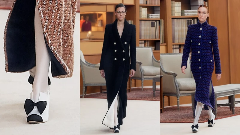 隨著音樂聲的響起,模特兒一個接著一個緩緩且縱容走出,整體系列飄散著奢華、靜謐和感性的氛圍。像是開場的斜紋軟呢大衣,那裁剪至腳踝處的長度以立體肩線和筆直線型帶出端莊中的中性質感。而品牌標誌性的經典雙色鞋則以蝴蝶造型的高跟鞋亮相,俏麗又不失黑白色組合的一貫優雅。
