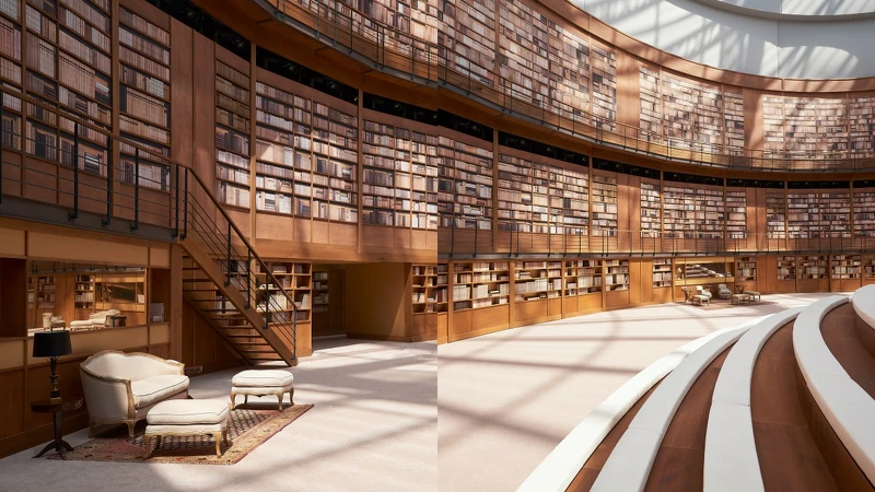 「一位有著自由不拘的外型並散發著冷靜優雅氣息的女性樣貌浮現在我的腦海,匯聚一切我所欣賞的香奈兒魅力特質。」Virginie Viard如此說道。這座不停變化場景的巴黎大皇宮內,如今為了呼應最新發表的2019/20秋冬高級訂製系列,轉眼變成了圓弧造型的香奈兒圖書館。造景上以淺棕色的木質版為主選材,搭配上井然有序的書籍排列和透光天景,使賓眾們在溫暖陽光的灑落下欣賞並感受濃郁的書券氣息。