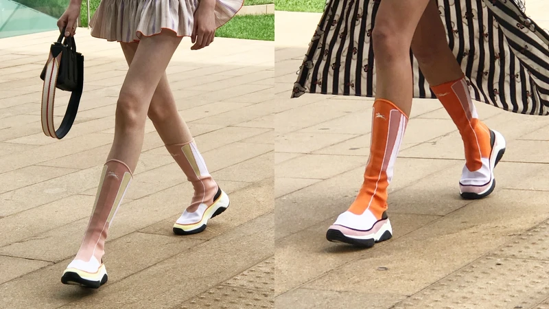 球鞋界的長筒靴就在這!在最新發表的時裝系列中,Longchamp將多套短裙造型和最新亮相的長襪運動球鞋搭配上,使整體呈現浪漫卻不失運動感的俏麗氣息。個性偏向中性酷女孩的可選擇黑+白色線條款,相反地,個性偏向甜美的則可挑一雙有著淡粉色系的拼接款…使每日造型多了不同的變化!