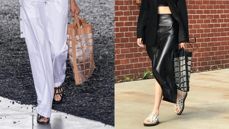 鞋子方面,一雙採用籠式和網格編織元素的平底涼鞋和細高跟鞋,則巧妙延伸並修飾了腳背身形,剛硬氣息中又流露著隱喻的性感氛圍。