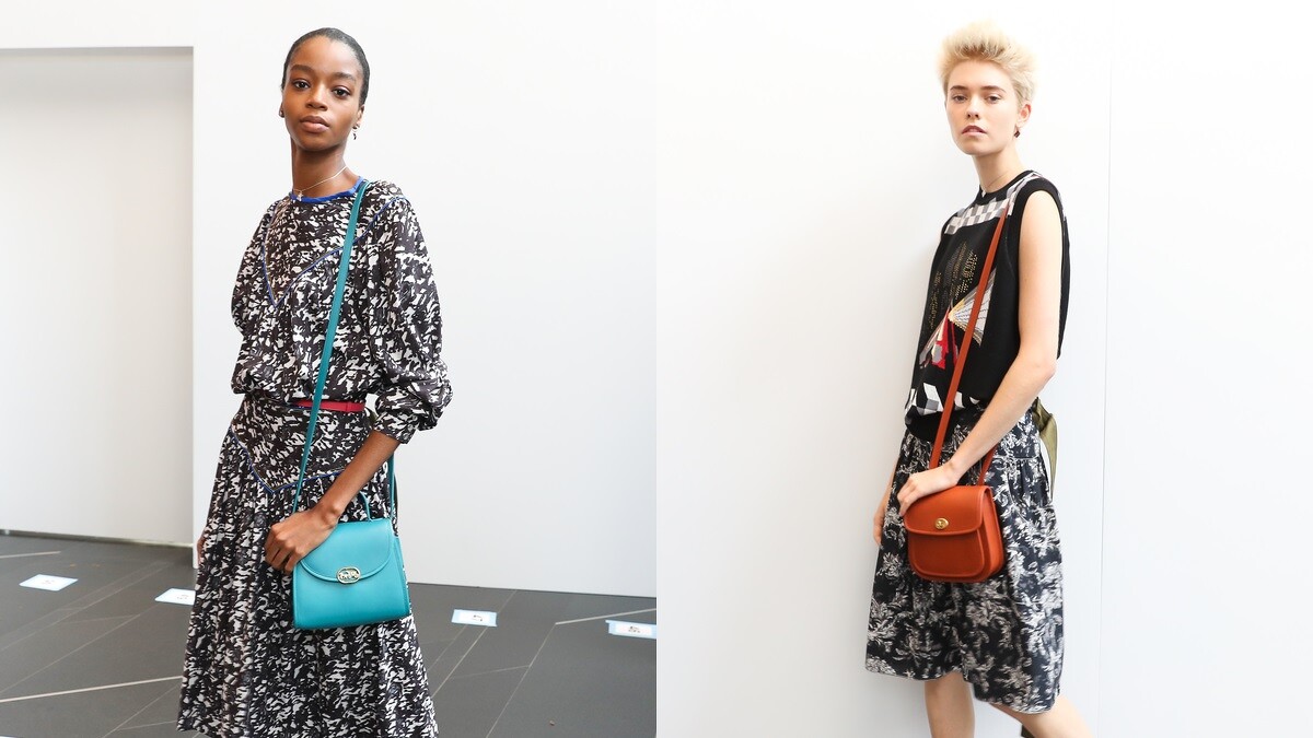 在服裝的部分,創意總監Stuart Vevers在背後加入腰帶設計,垂墜的腰帶隨著模特兒的步伐飄逸,就仿佛象徵品牌崇尚自由的精神,而衣領處也有小巧的別針造型相當吸睛。值得一提的是,這回春夏系列Coach攜手美國普普藝術家Richard Bernstein,運用趣味的插畫結合品牌悠久的皮革工藝,創造多款充滿活力的手袋系列,也成為秀上一大亮點。