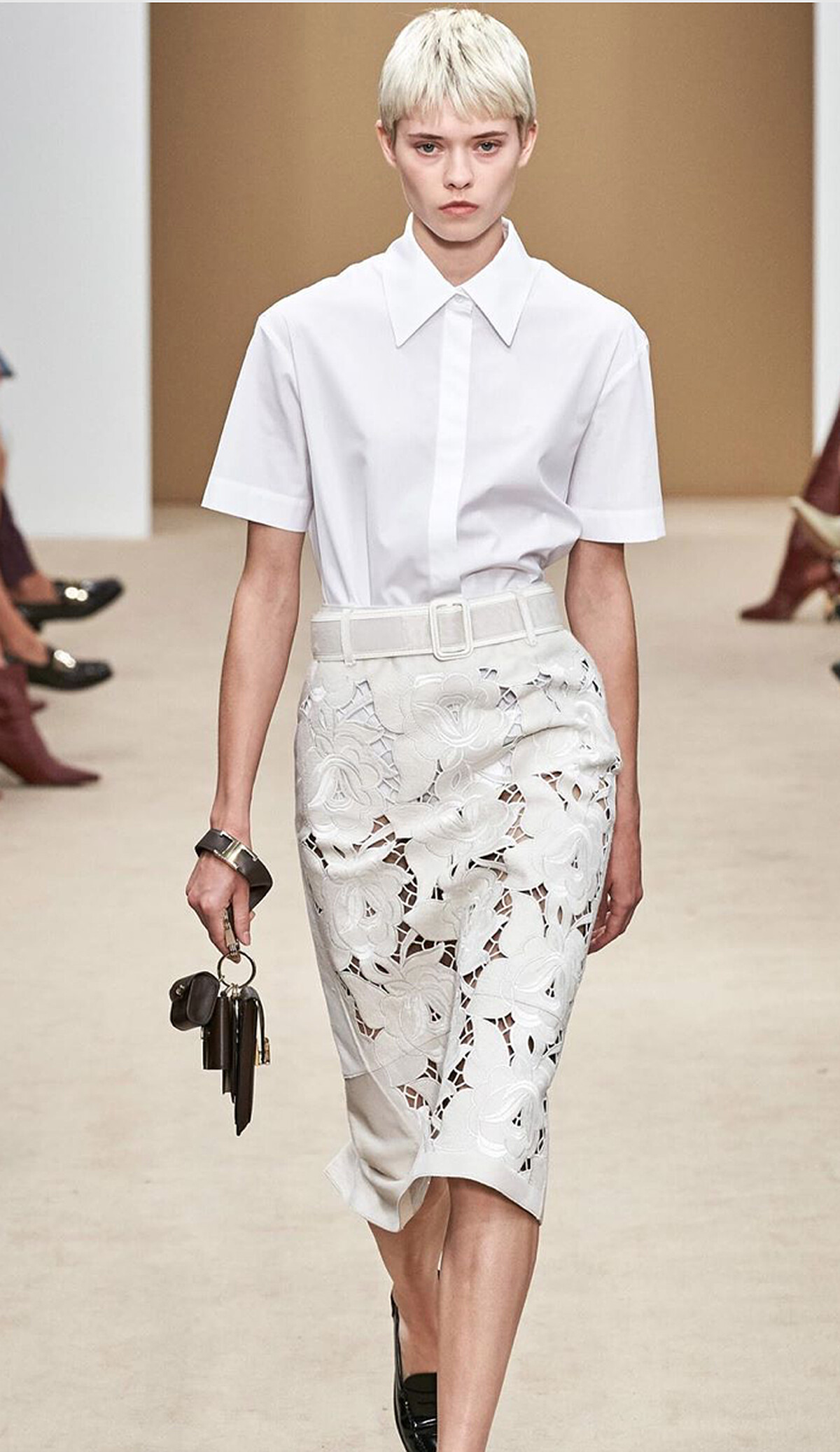 2020春夏,來自Tod's的配件建議是:「包包不嫌多,一次請拎三個!」秀上模特兒隨意手持三只小巧包款,由圓形、方形及長型三種形狀組成的包款,同時附上肩背帶,讓你不管是繞在手腕上,或是斜跨肩背,都有型率性。